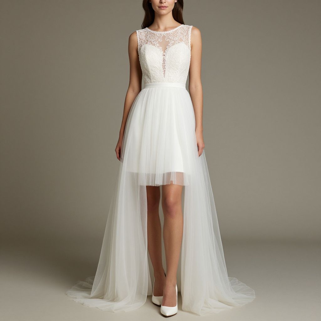 Elegant woman modeling a cut lace tulle short prom dress featuring a high-low silhouette with a flowing skirt and sheer train, paired with white heels against a neutral backdrop.