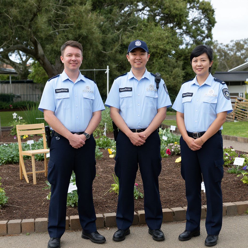 Photograph of a male police officer in uniform and a middle-aged Asian woman in a blue polo shirt standing in a lush garden with raised beds and vibrant
