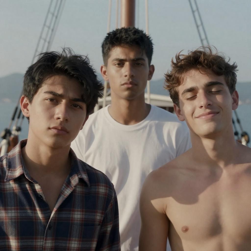 Photograph of three young men on a ship. First man, dark hair, serious expression, plaid shirt. Second man, short dark hair, neutral expression, white t-shirt. Third man, short brown hair, closed eyes, smiling, shirtless. Ship's rigging and mast in background, mountains in distance. Sunlight illuminates faces and ship.