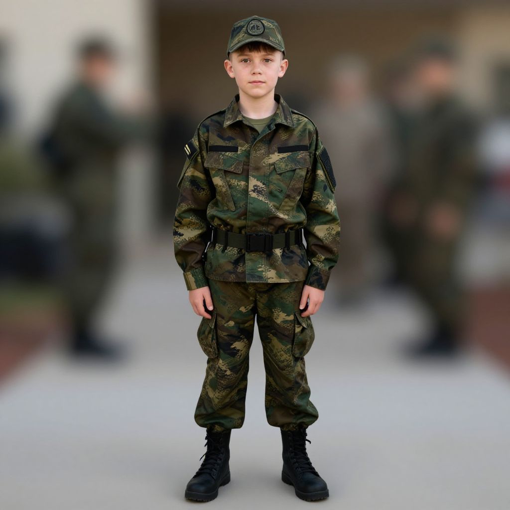 Army brat halloween costume, camouflage, 1boy, male focus, blurry background, blurry, hat, uniform, military, military uniform, solo, camouflage pants, jacket, belt, standing, looking at viewer, pants, full body, long sleeves, realistic, camouflage jacket