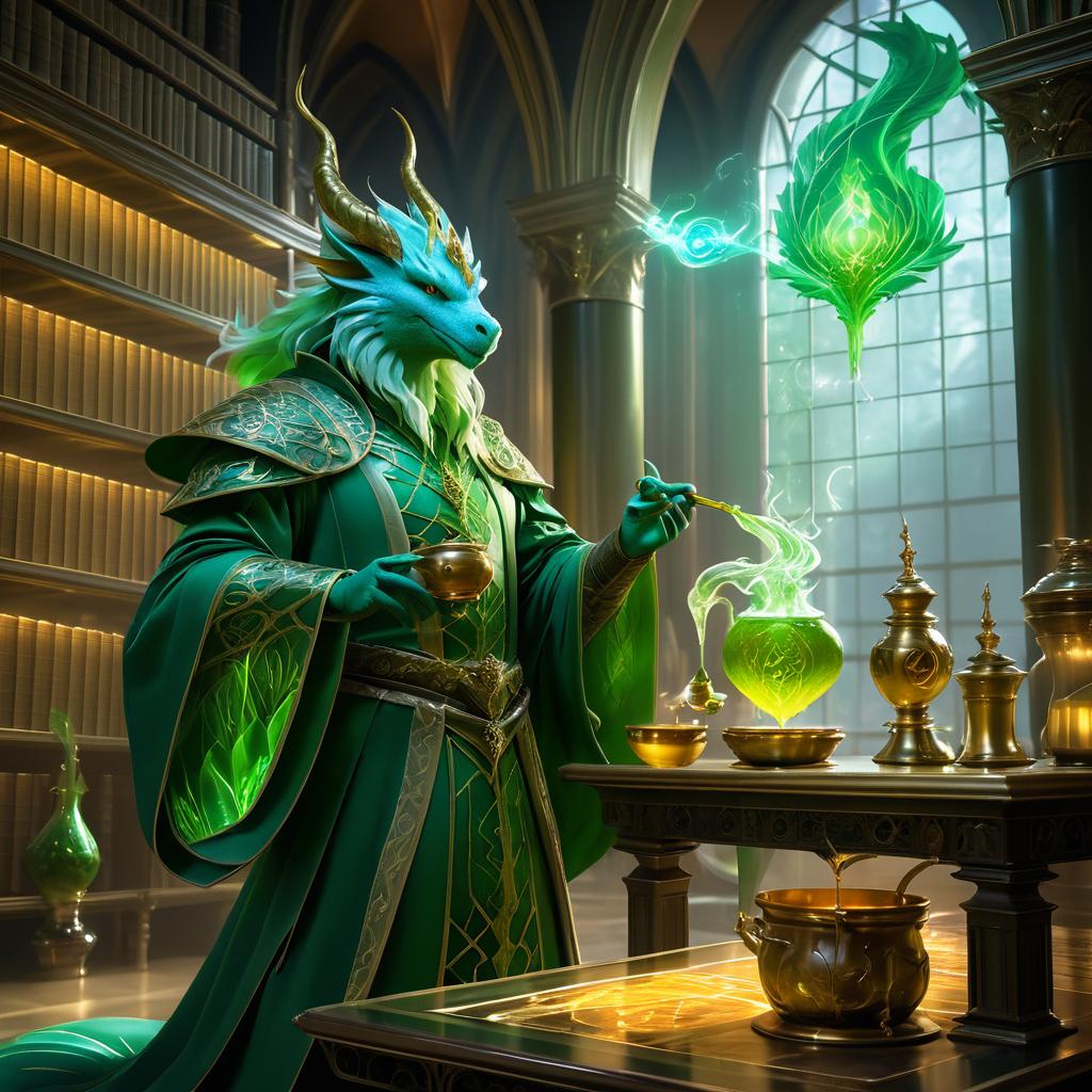 A detailed digital artwork of an anthropomorphic blue dragon sage dressed in ornate green robes and golden armor brewing a glowing green potion in a grand library. The scene features a large arched window with soft volumetric lighting illuminating the magical, mystical atmosphere. The dragon holds a golden cup and a brush, surrounded by ancient alchemical containers and a swirling magical aura.