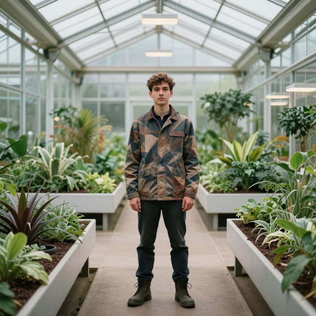 A photograph of a young man standing in a greenhouse. He has curly brown hair and a neutral expression. He wears a camouflage-patterned jacket, black pants, and black boots. The greenhouse has a glass ceiling and walls, with bright overhead lights. The background is filled with lush green plants in white rectangular planters. The man is centered in the image, with the greenhouse's pathway leading directly to him. The overall atmosphere is bright and verdant, with the greenery contrasting against the man's dark clothing.