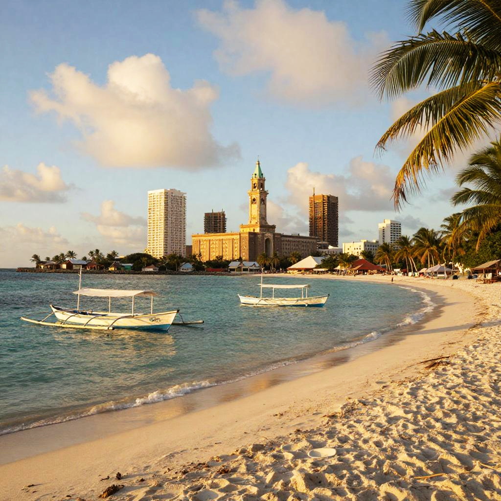 Scenic beach scene at golden hour featuring white sandy shores, traditional fishing boats floating on calm turquoise waters, palm trees lining the coast, and a city skyline with a prominent clock tower and high-rise buildings under a partly cloudy sky.