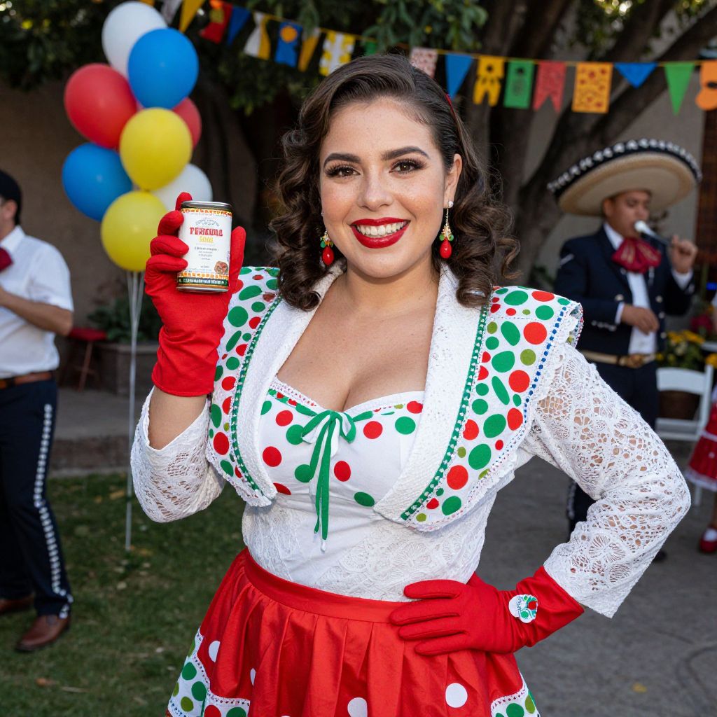 A cheerful Cinco Mayo costume woman posing in a festive backyard party in Mexico City, dressed in a red and green polka-dot huipil with a matching skirt, wearing a white lace blazer and red gloves, her face has bright red lipstick and a freckled, friendly expression, holding a small tin of tequila with a smile, with colorful balloons and mariachi music visible in the background. The woman has big tits and cute face