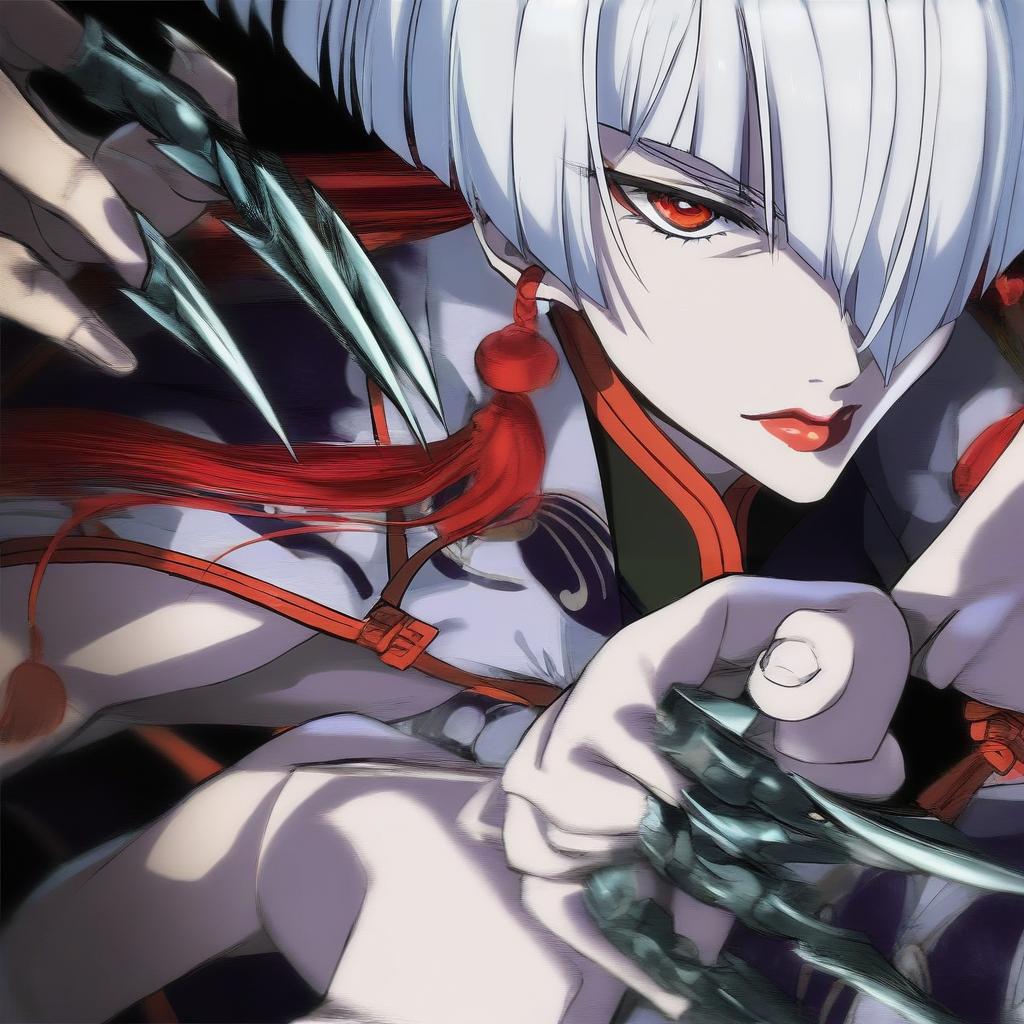 A.k.i. (street fighter), street fighter, 1girl, pale skin, red lips, mole under mouth, red eyes, hair over one eye, short hair, white hair, grey hair, china dress, chinese clothes, tassel earrings, claw (weapon), claw ring, by artist kimura takahiro, leet