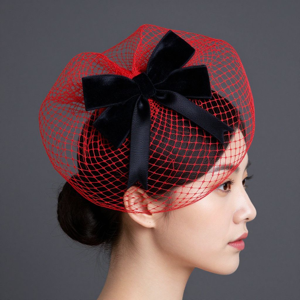 Elegant profile of a woman wearing a black wool headpiece adorned with a vibrant red netting overlay, featuring a central black velvet bow and ribbon accent.