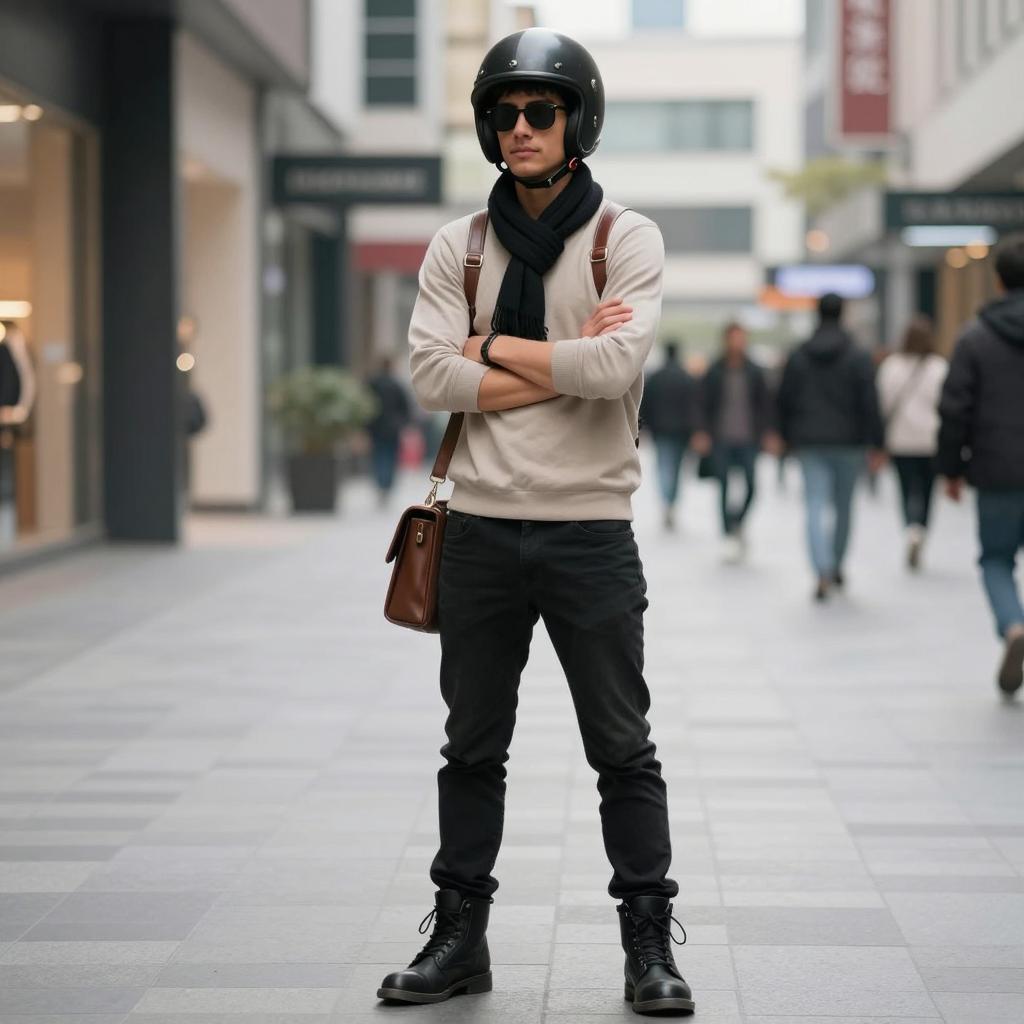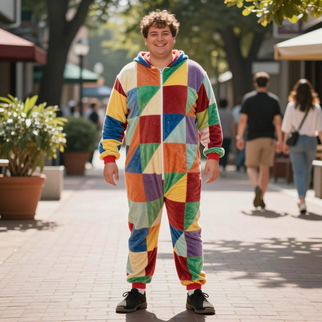 Red guy dont hug costume, photorealistic, street scene, man in red full-body costume, hood up, arms crossed, standing center, daytime, urban setting, sunlight, people in background, red shopfronts, hanging red lights, street lamps, blurred background, casual clothing, cobblestone street, realistic lighting, shadows, mixed crowd, early morning or late afternoon