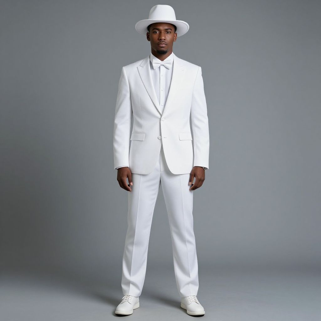 All White Party Outfit Man Costume, man in a white suit and hat standing in front of a gray background