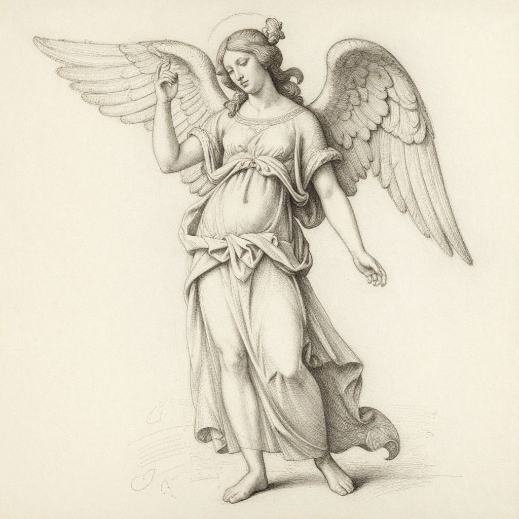 Black-and-white pencil drawing of a serene, winged angel with flowing dress, halo, and delicate wings, standing barefoot, gently lifting a finger