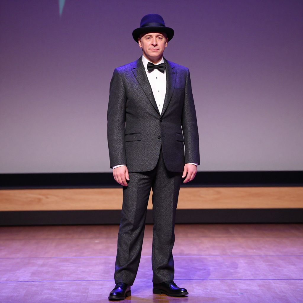 Photograph of a middle-aged white man standing on stage, centered in the frame. He is wearing a black, textured, pinstripe suit with a white dress shirt and black bow tie, topped with a black bowler hat. His shoes are black and polished. The man has fair skin, a neutral expression, and short, light brown hair. The background is a plain, gradient stage with a purple and grey hue, and a wooden bench is visible in the lower background. The stage floor is polished wood, illuminated with subtle purple lighting.