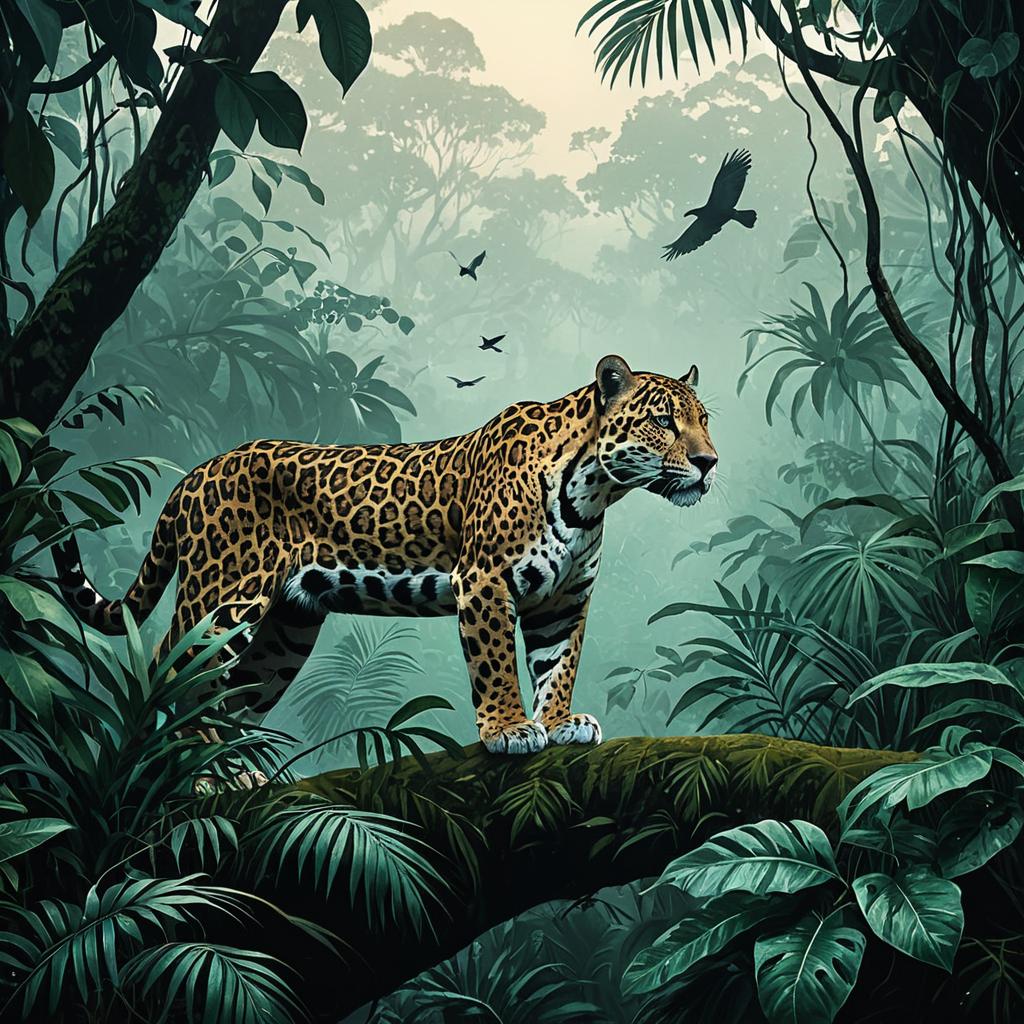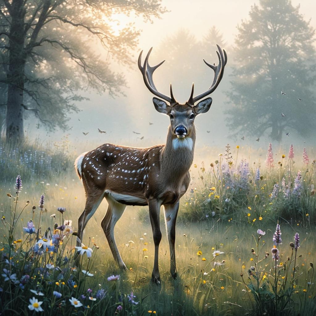 A tiny hummingbird standing on a blooming flower garden at dawn, surrounded by delicate petals, morning dew, and soft sunlight, illustrated in vivid and detailed naturalistic painting style
