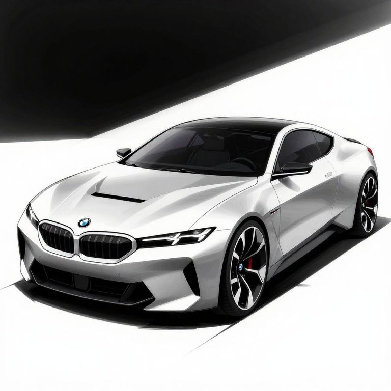 Digital art of a sleek, silver BMW sports car with black accents, sharp lines, and high-performance wheels, set against a stark white and black background