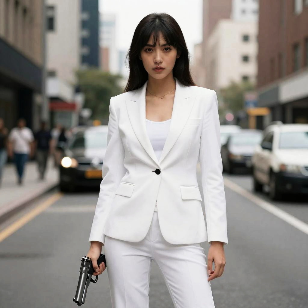 Scarface Costume Women, woman in white suit holding a gun on a city street
