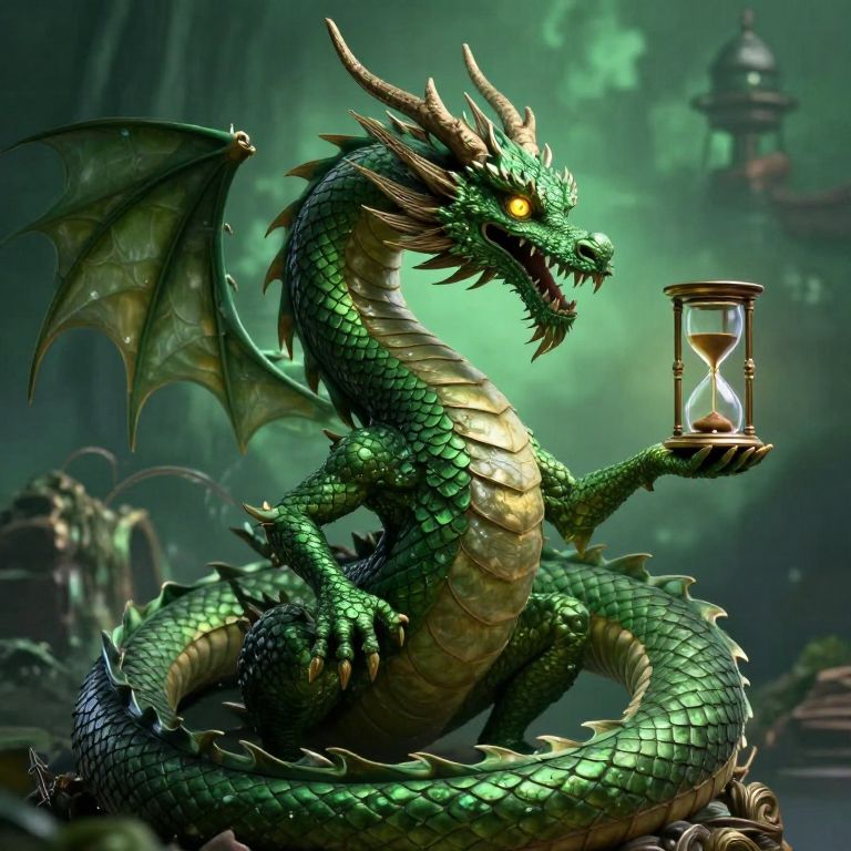 Time whispers secrets through the coils of a verdant dragon, its golden eye flickering with the weight of eternity as it cradles a suspended hourglass, symbolizing the delicate dance between life’s fleeting moments and the endless march of time.