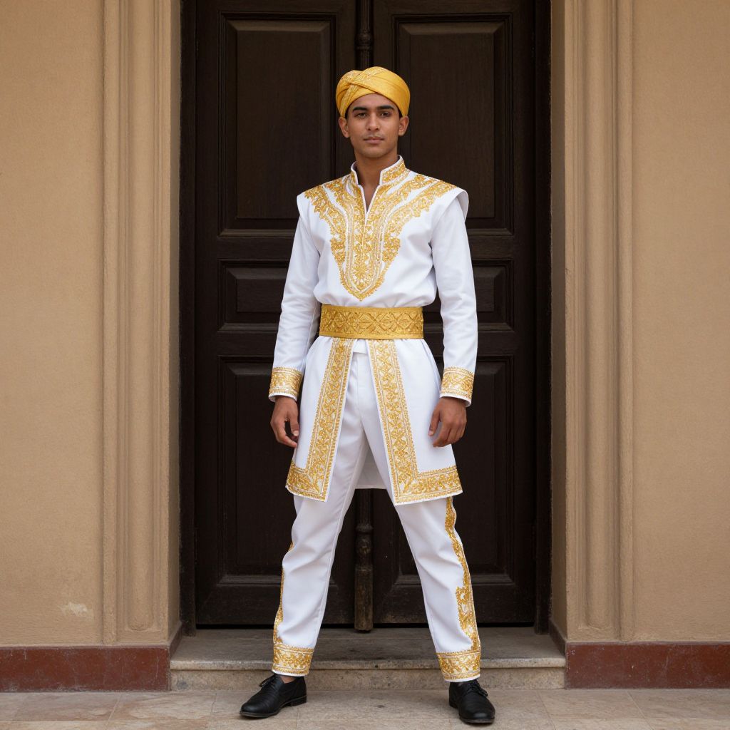 Jive Costume Male, dressed in a traditional costume standing in front of a door