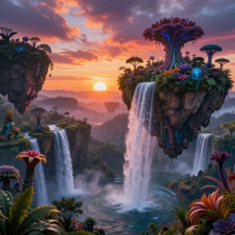 Tedst surreal landscape, floating islands with waterfalls cascading into abyss, vivid sunset sky with layered clouds, exotic alien flora surrounding, hyperrealistic details, magical and ethereal mood, wide panoramic view