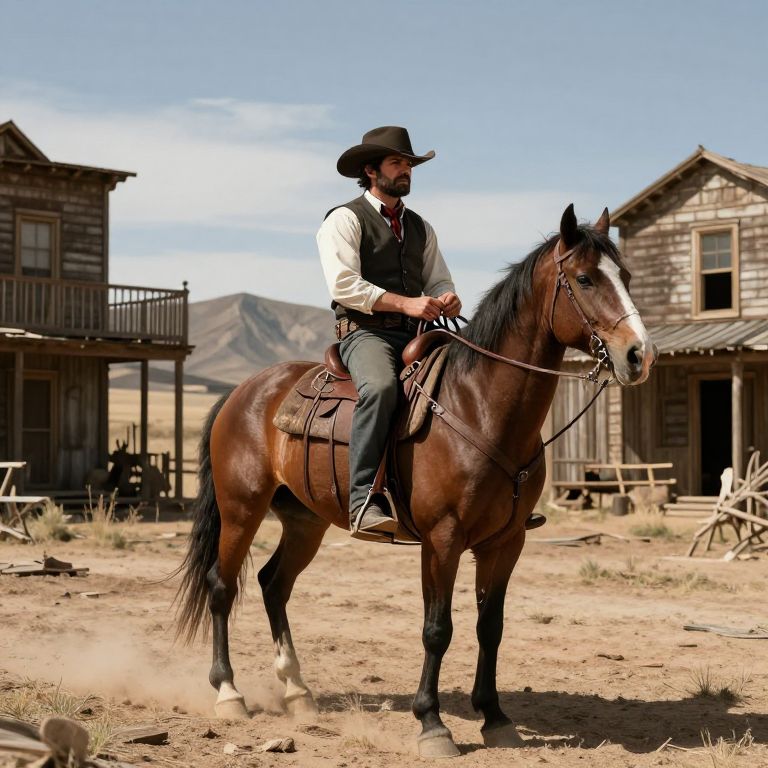 A cowboy on horseback in a red dead redemption art style, set in a desolate ghost town in the wild west.