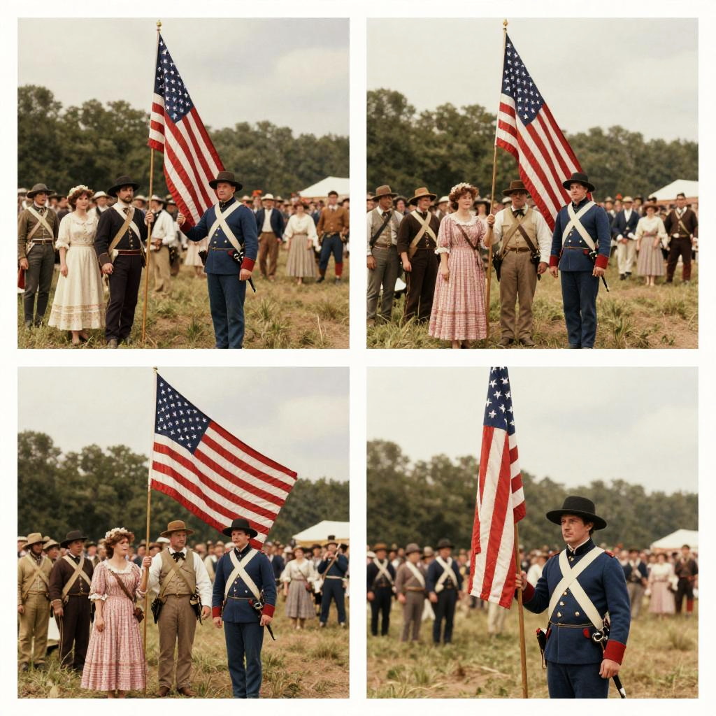 This is a collage of four vintage-style photographs showing a Civil War reenactment. Each image features a crowd of people in 19th-century clothing, holding large American flags. The top-left and top-right images show groups of men and women standing, while the bottom-left image includes a woman in a pink dress. The bottom-right image shows a man in a blue uniform holding a flag. The background includes trees and a cloudy sky. The overall color palette is warm and historical.