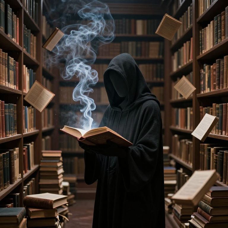 Photograph of a mysterious figure in a black hooded cloak standing between two tall, wooden bookshelves filled with books. The figure, with a face obscured by the hood, is holding an open book emitting blue, wispy smoke that curls upward. Several books are suspended in mid-air around the figure, as if magically levitating. The background shows rows of more bookshelves, creating a narrow, library-like corridor. The lighting is dim, emphasizing the smoke and the shadowy figure, evoking a sense of magic and mystery.