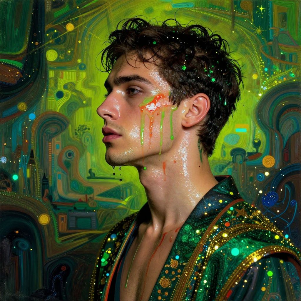 An impressionistic upper-body portrait of a young man from head to hip, his face glistening with oily skin that reflects light dynamically, Intricate colored dots in shades of emerald, gold, and hints of neon blue glow around him, framing the composition with a vibrant energy, His profile is captivating as he gazes thoughtfully into the distance, with toxic-colored fluid in vivid reds and greens spilling over his cheekbones and jawline, creating a visually striking contrast, He wears avant-garde clothing that fuses traditional elements with modern cuts, enhancing his artistic expression and individuality, Shot with a 50mm lens from a slightly elevated angle, the focus highlights the dramatic interaction between the shimmering fluid and his reflective skin, Behind him, the surrealist-inspired background—reminiscent of Giorgio de Chirico—features enigmatic, abstract forms and shadowy, mysterious landscapes, interwoven with impressionistic brush strokes, delicate dot patterns, and a bold lime green tint that creates depth and vibrancy, lending the scene a surreal, dreamlike quality