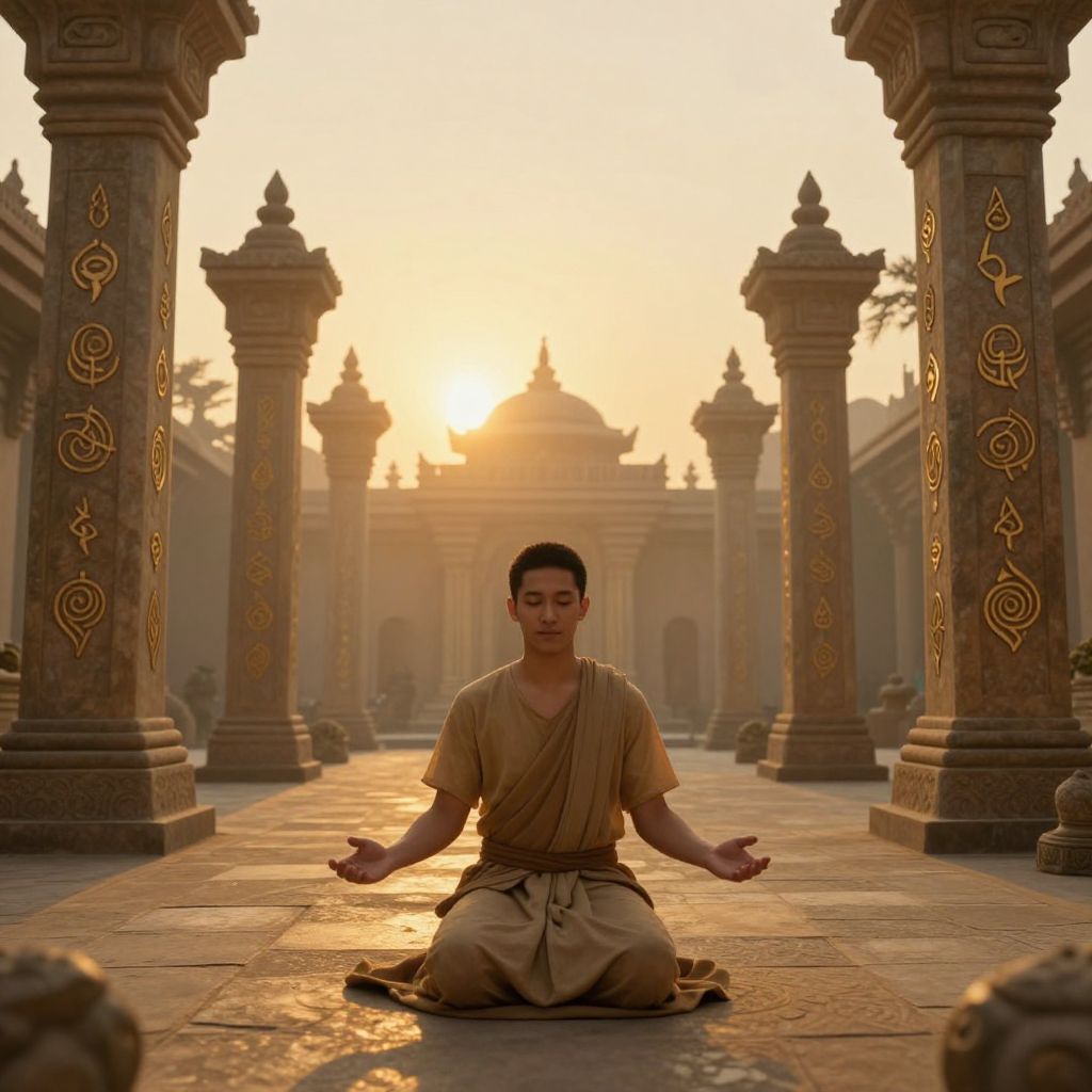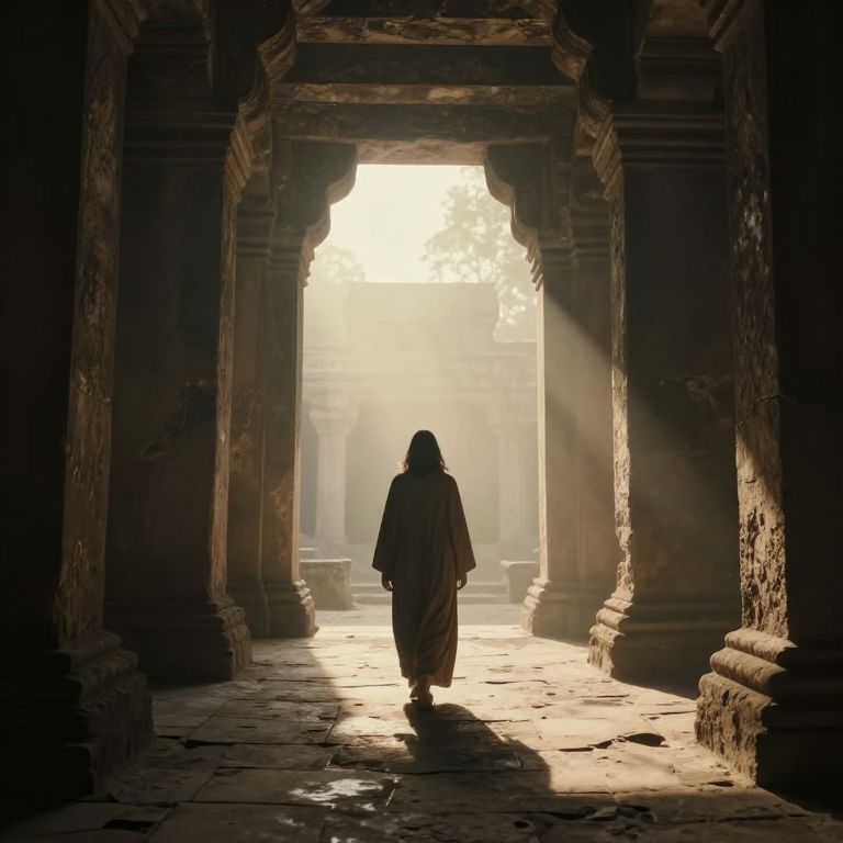 In the hushed embrace of ancient stone, a solitary figure walks toward the radiant light, where the weight of history meets the ethereal promise of transcendence, evoking a profound sense of introspection and the timeless quest for meaning.