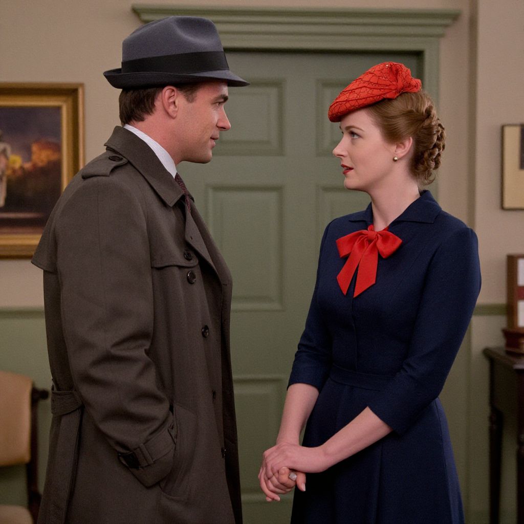 Photograph of a 1940s-style scene featuring a man and woman standing indoors. The man, with fair skin and dark hair, wears a black fedora, brown coat, and white shirt, looking at the woman. The woman, with fair skin and brown hair in a neat updo, wears a black dress with a red bow at the collar and a red, polka-dotted hat. She holds her hands together in front of her. The background includes a green door, framed painting, and beige furniture. The overall tone is vintage and romantic.