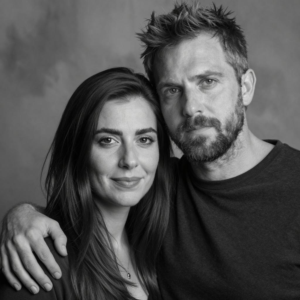 Close-up portrait of a woman with brown hair, wearing a white shirt and a purple scarf, showing an angry expression with her mouth open wide. Next to her is a man with pale skin and purple theatrical makeup on his face, featuring a grotesque grin, wearing a gray and white striped shirt. Both subjects are seen against a neutral gray background.