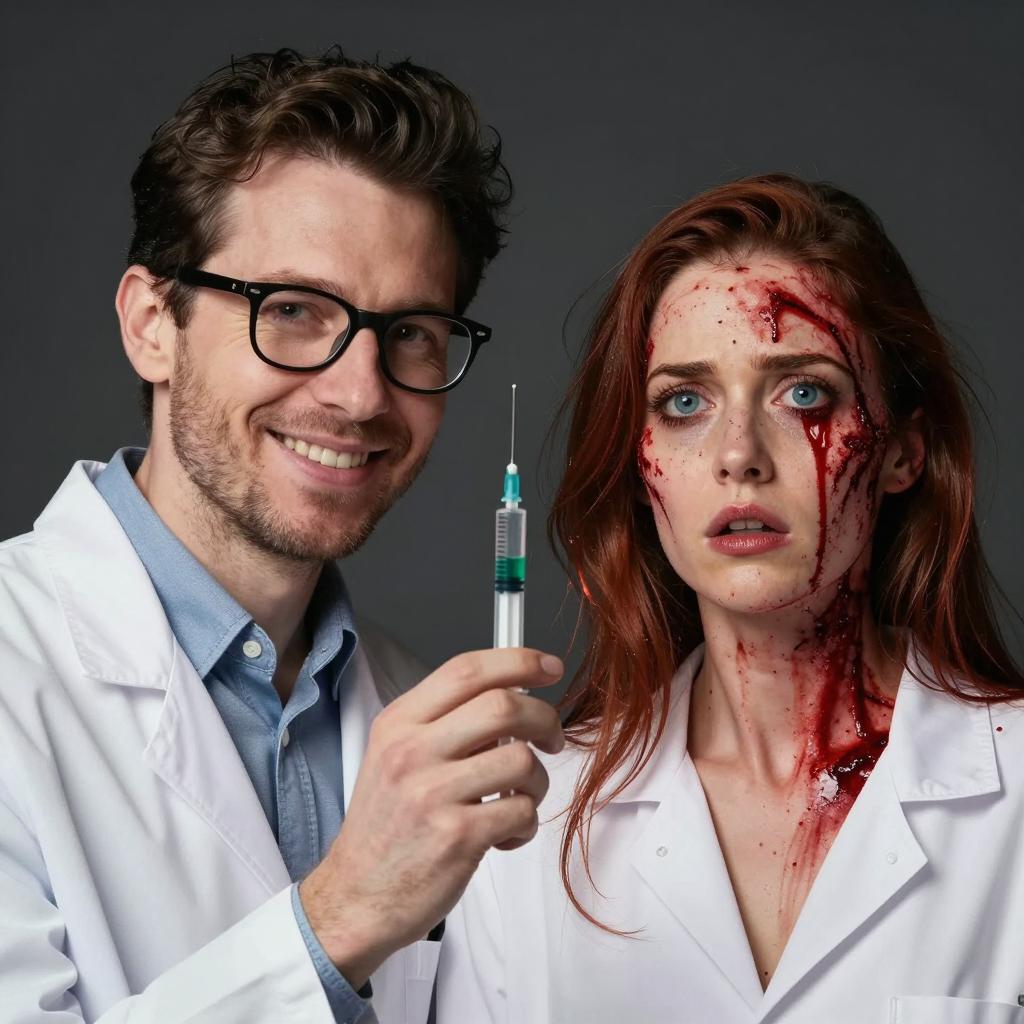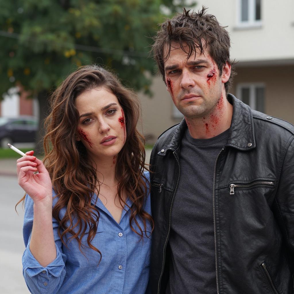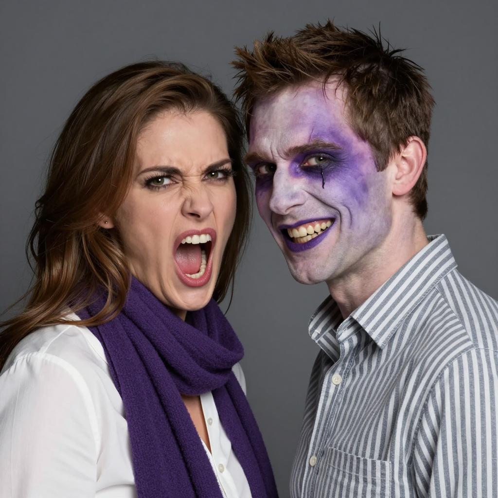 Two people. The woman on the left has brown hair, an angry expression with mouth open wide, wearing a white shirt and purple scarf. The man on the right has pale skin, purple makeup, and a grotesque grin, wearing a striped shirt. They are close together, with the man's head slightly tilted towards the woman's face.
