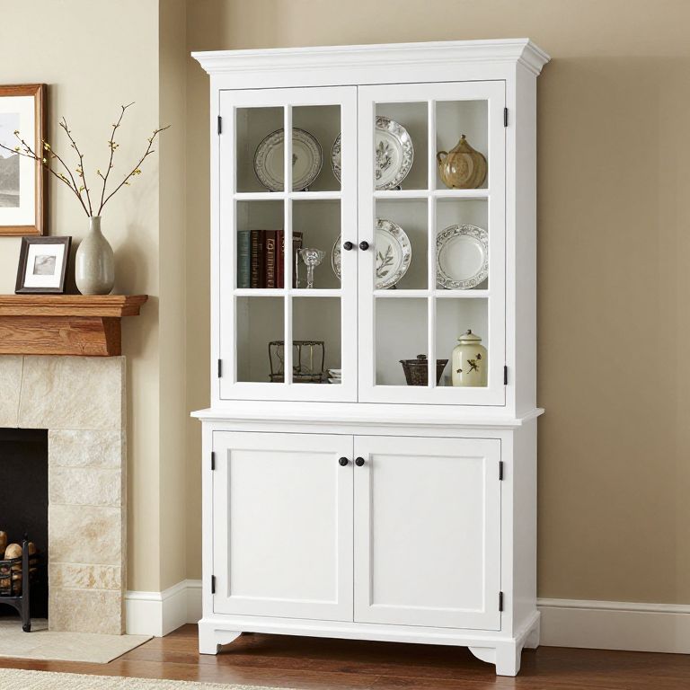 White dining hutch with glass-paneled doors and ironstone display items stands beside a stone fireplace, featuring two upper cabinets filled with decorative plates, books, and ceramic pieces, complemented by two lower solid doors, all set against a beige wall with a wooden mantel holding a vase of branches and framed photograph.