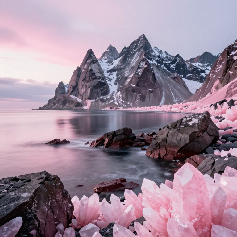 The image presents a desolate coastline, filled with jagged rocks and giant fang-shaped mountains, creating a dramatic and otherworldly landscape. The scene is dominated by a vast expanse of pink crystals, reflecting the light and adding a surreal touch to the environment. The mountains, with their sharp, angular peaks, rise majestically in the background, their surfaces covered in a layer of snow that contrasts with the warm tones of the foreground. The water, a mix of pink and gray hues, mirrors the surrounding landscape, creating a sense of symmetry and depth. The overall composition is balanced, with the mountains and rocks creating a natural frame for the scene, while the pink crystals add a touch of fantasy and wonder. The image is a stunning example of environmental art, capturing the essence of a forgotten realm, where nature's beauty and power are on full display.