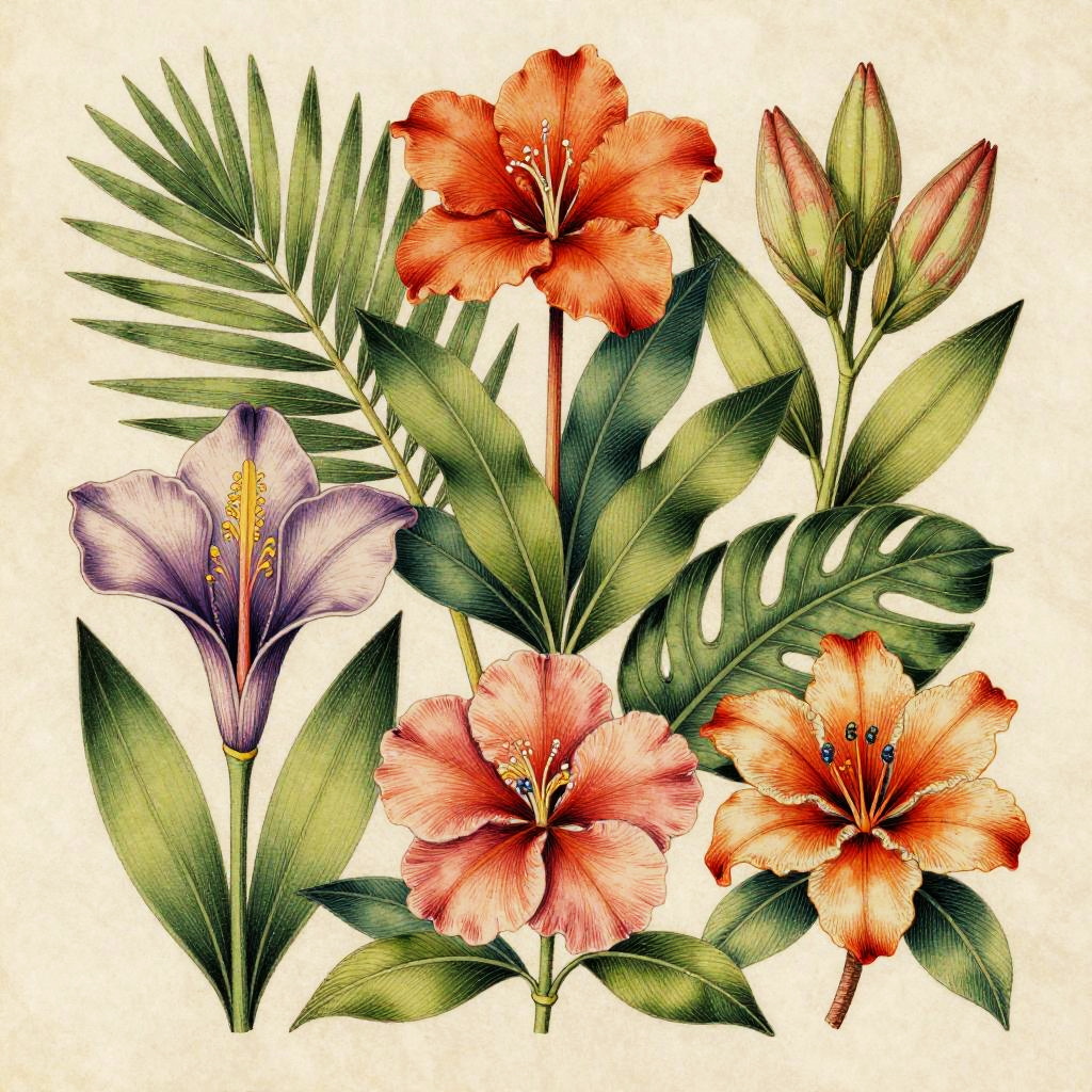Handgemalt style vintage botanical illustration featuring various tropical flowers and lush green leaves, rich vibrant colors, delicate linework, antique paper background, subtle embossing effect, elegant and timeless artistic design.