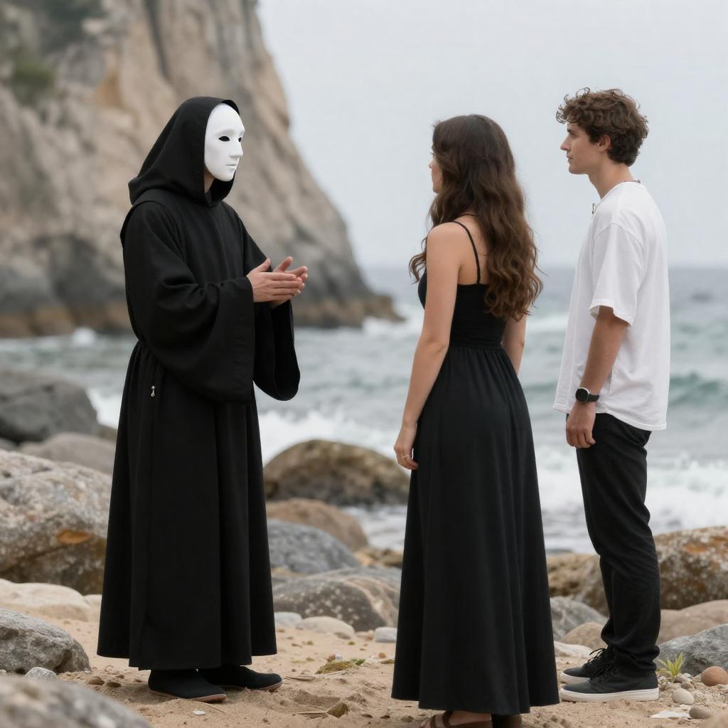 Photograph of Disney's "The Little Mermaid" characters on a rocky beach. Two people in black monk robes, one with a white face mask, stand facing a woman with long brown hair and a black dress, and a man in a white shirt and black pants. Background includes a cliff and ocean. The monk with the mask gestures towards the woman. Three people total.