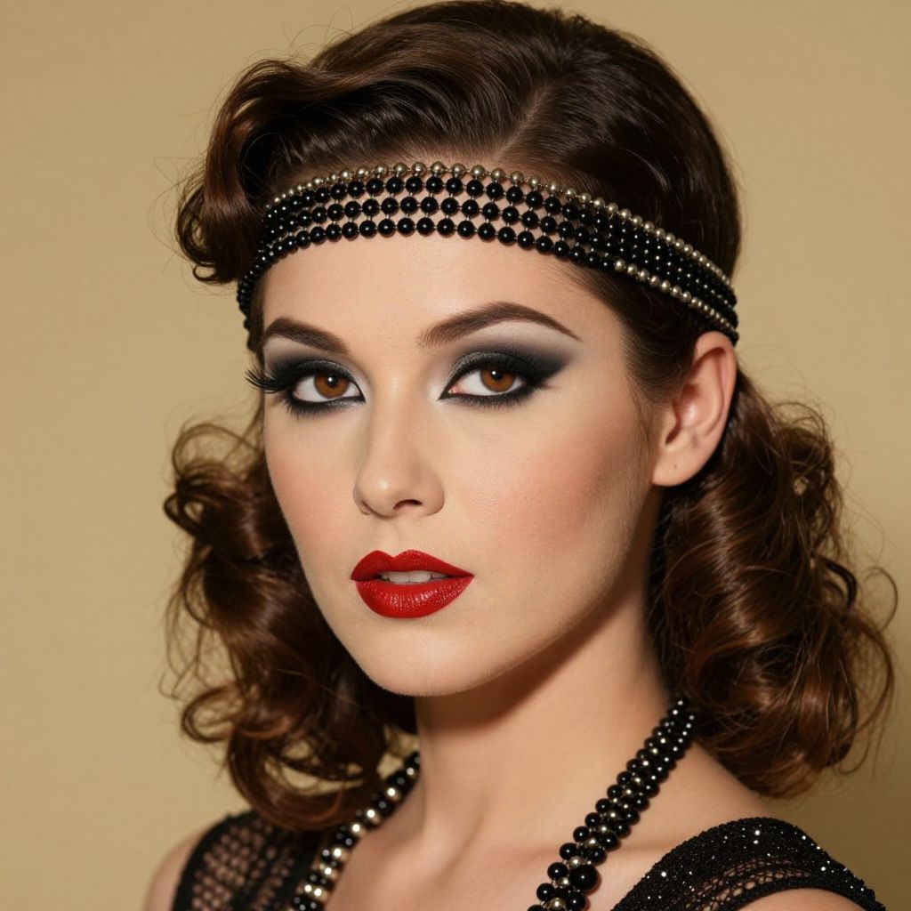 A vintage-inspired portrait featuring a woman with classic 1920s flapper makeup, characterized by bold black eyeliner, smoky eyeshadow, and glossy red lipstick, complemented by a beaded headband and styled hair, evoking the glamour and elegance of the Roaring 20s era.