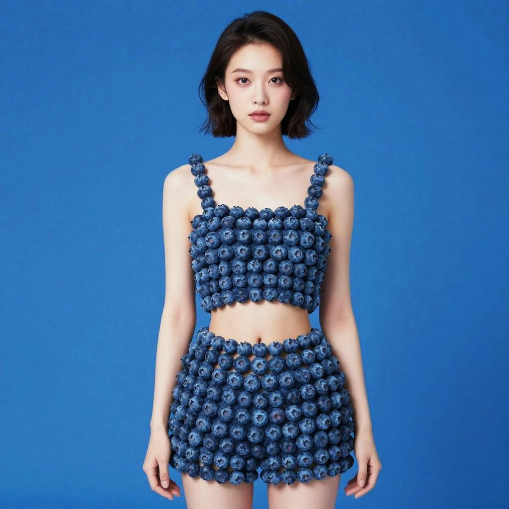 This striking image features a woman adorned in a unique outfit made entirely of blueberries, creating an eye-catching and surreal visual effect. The bold blue background complements her vibrant look, emphasizing the creative blend of fashion and nature. This concept reflects a whimsical style that challenges traditional beauty norms.