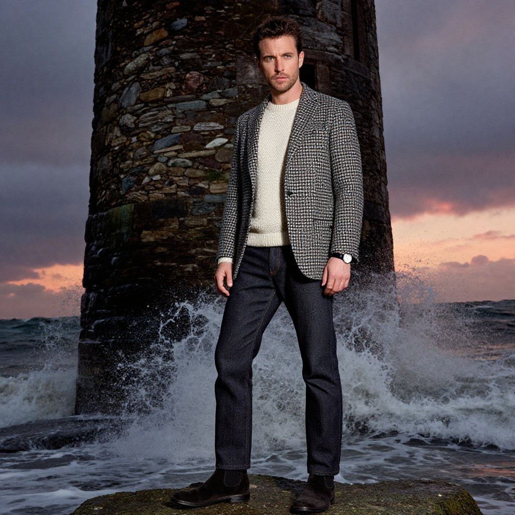 A man, charcoal houndstooth blazer, cream merino wool sweater, dark denim jeans, black suede Chelsea boots, black leather watch, rustic stone tower, crashing waves below, dramatic sunset sky, technicolor analog film stock, confident expression Man has masculine face and piercing eyes