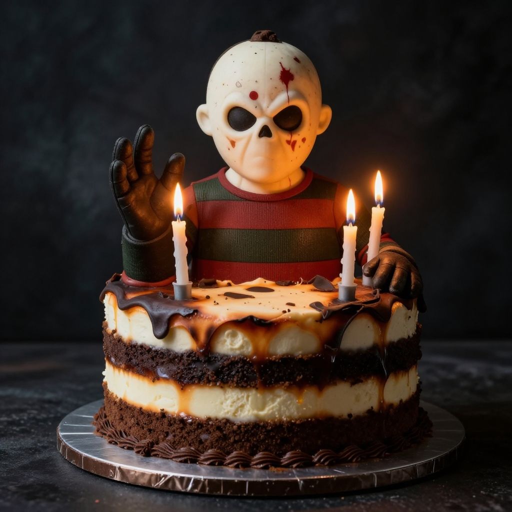 Freddy Krueger cake ideas depicting a horror scene cake with mini Freddy figure, claw marks revealing red velvet inside, intricate fondant work, moody lighting