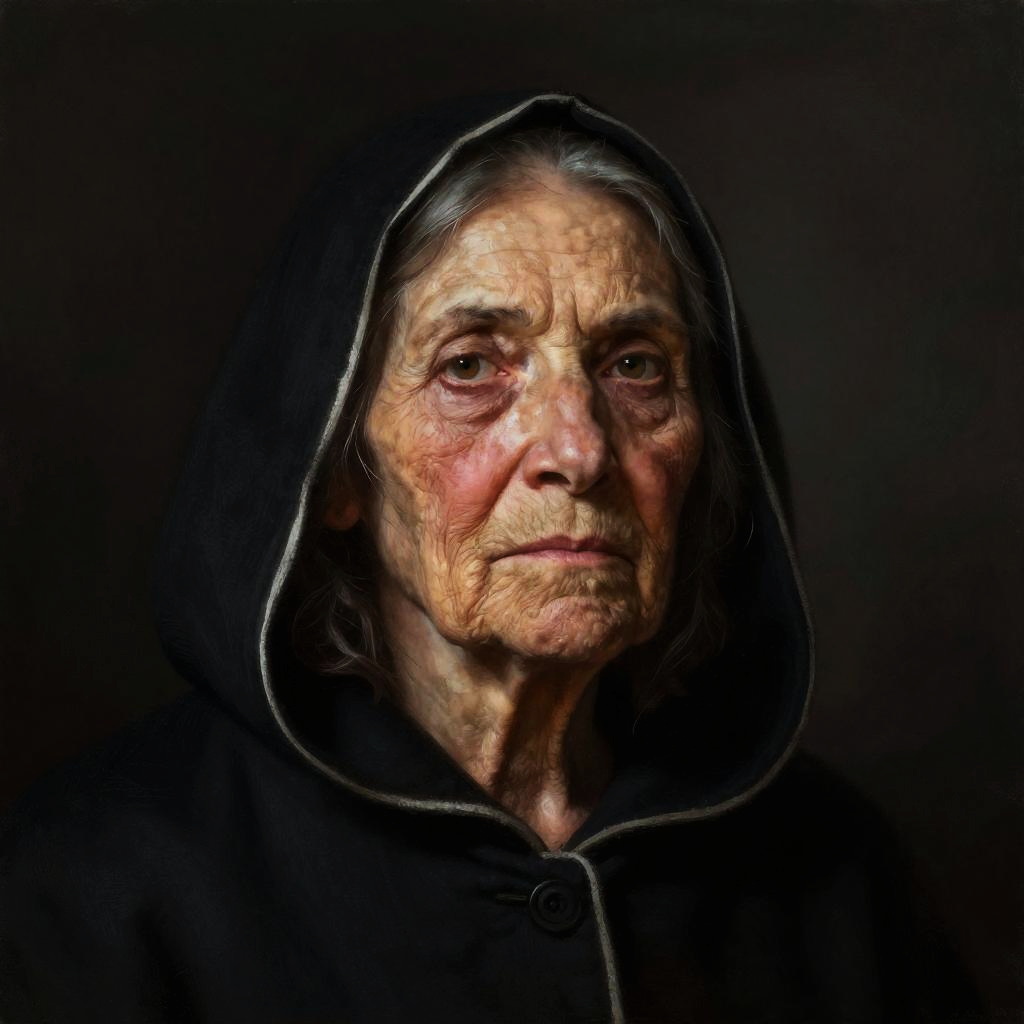 This is a detailed, digital painting of an elderly woman with a wrinkled face, wearing a black hooded garment with a white trim that frames her face. The background is dark and textured, making her expression stand out. The lighting emphasizes her high cheekbones and deep-set eyes, giving her a solemn, dignified look. The overall style is realistic with a slightly dramatic, high-contrast effect.