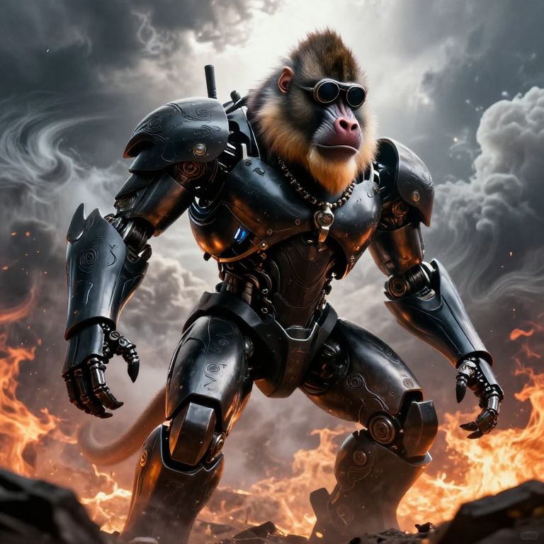 The image depicts a highly detailed and hyperrealistic depiction of a mandrill, transformed into a massive, metallic robot. The robot's body is composed entirely of black-Vibranium, a material known for its strength and durability, with hand-drawn tornado patterns adding a dynamic and intricate design element. The robot's skin is smooth and reflective, with metallic body parts that include intricate mechanical components and joints. The mandrill's face is adorned with a pair of goggles and a necklace, both crafted from the same black-Vibranium material. The robot stands on all fours, with its arms and legs extended, exuding a sense of power and readiness. The background is a dramatic scene of heavy wind, fire, and bright colors, with sunlight shining through dark storm clouds, creating a stark contrast with the robot's dark form. The overall composition is highly complex, with the robot positioned centrally, surrounded by the chaotic elements of the storm. The image is a stunning example of advanced digital artistry, utilizing the Unreal Engine 5 to create an ultra-realistic, 30-megapixel, 4k, 85mm lens photograph with a sharp focus and intricate detail. The lighting is diffuse, with a backlight that enhances the robot's metallic sheen, creating a sense of depth and dimension. The image is a testament to the capabilities of modern photography and digital art, capturing the essence of the mandrill robot in an awe-inspiring and realistic manner.