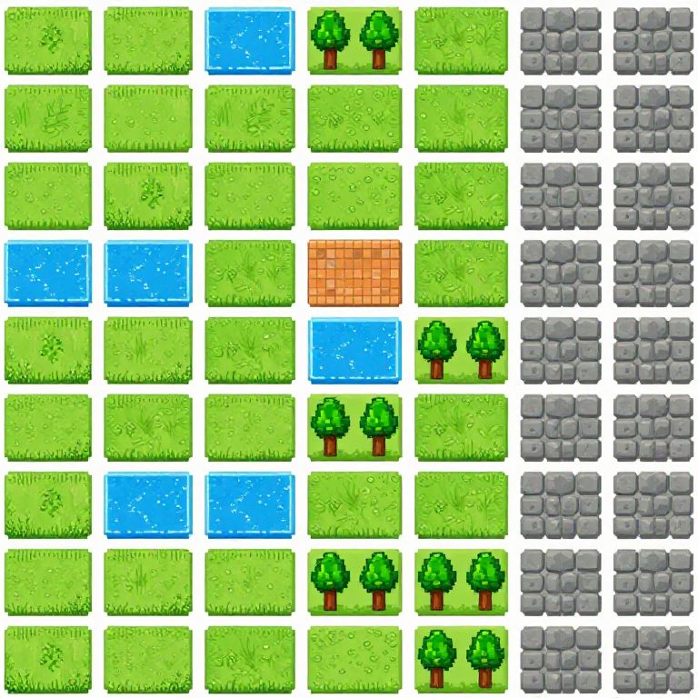 Grid of colorful, pixelated squares featuring green grass, blue water, orange brick, and grey stone, with small green trees. Digital art, game