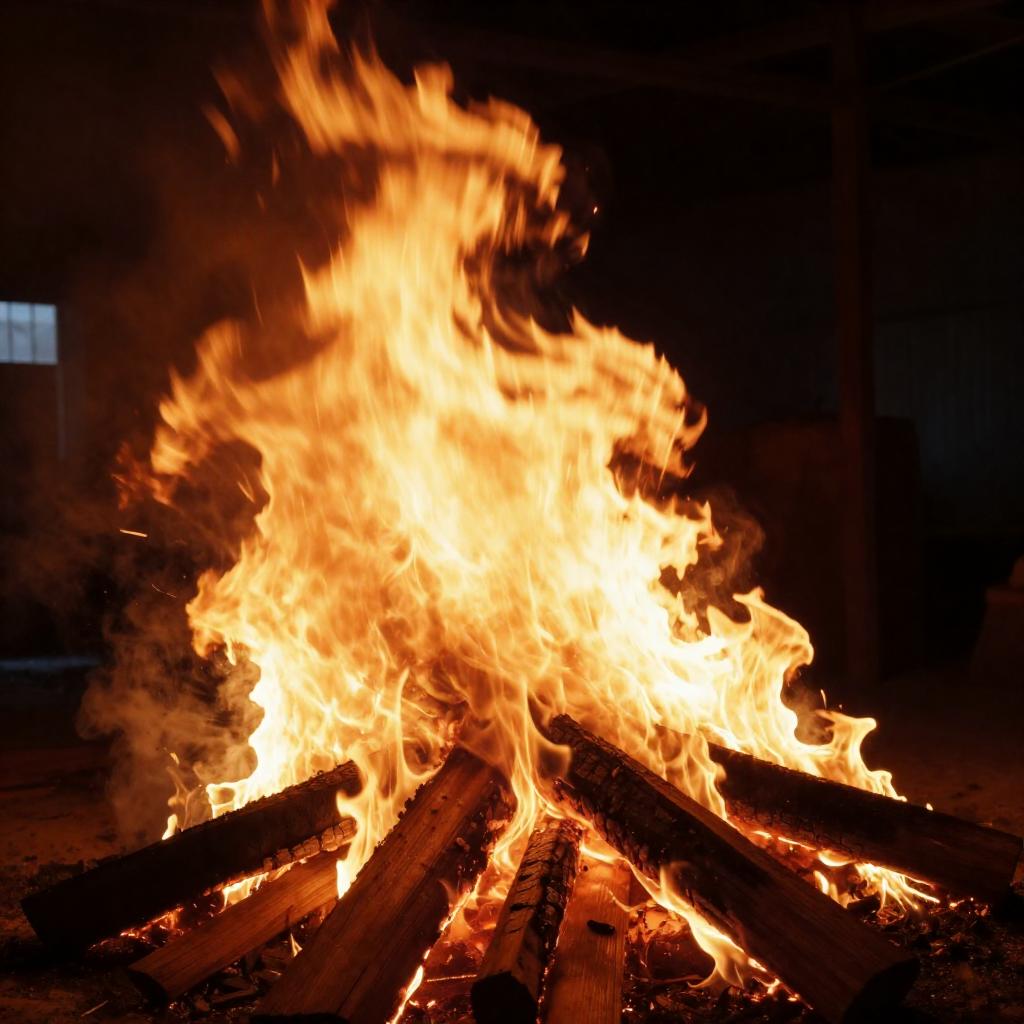 Black-and-white photograph of a nighttime explosion scene. A large, partially destroyed building with exposed metal beams and debris is illuminated by bright, white explosions. Sparks and smoke fill the air, creating a chaotic atmosphere. The foreground is cluttered with rocks and twisted metal.