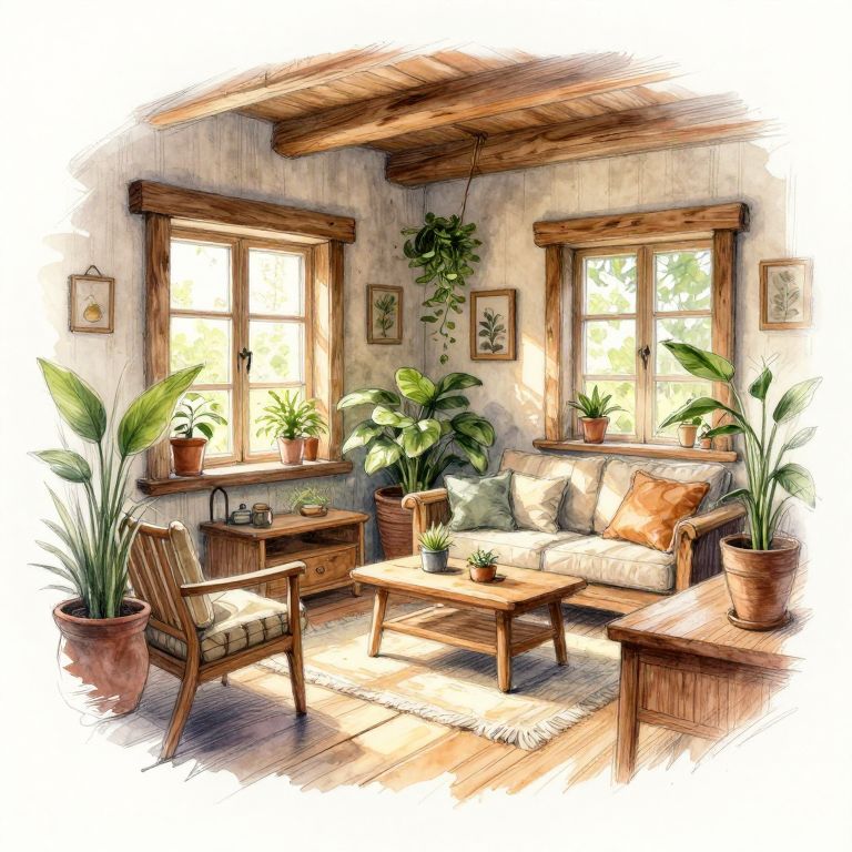 This digital illustration depicts a cozy, sunlit living room with a rustic charm. The room features wooden ceiling beams and two large windows with wooden frames, allowing natural light to flood in. A wooden sofa adorned with green and orange cushions sits against the windows, while a matching wooden coffee table with a small potted plant on it stands in front. Two wooden armchairs with beige cushions flank the sofa. Potted plants of various sizes and types, including ferns and leafy greens, are placed on windowsills and the floor. The walls are adorned with small framed pictures, and the wooden floor is partially covered by a small, fringed rug.