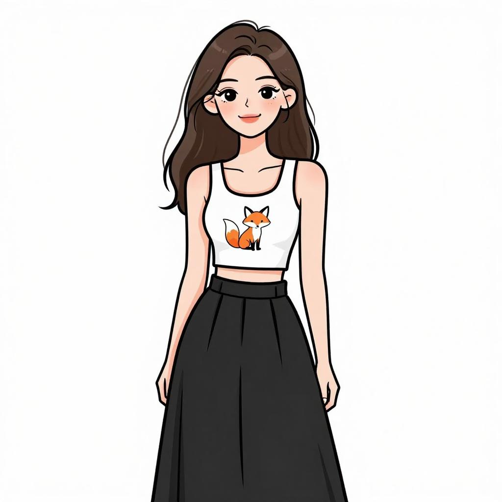 This is a digital drawing of an Asian woman with medium-length, straight dark brown hair and fair skin. She has large, expressive brown eyes and a warm smile. She wears a white sleeveless crop top with a small orange fox graphic on the chest and a high-waisted black skirt that reaches her ankles. Her arms are relaxed by her sides. The background is plain white, making her the focal point. The art style is simple and cartoon-like, with clean lines and minimal shading. The overall look is casual and modern.