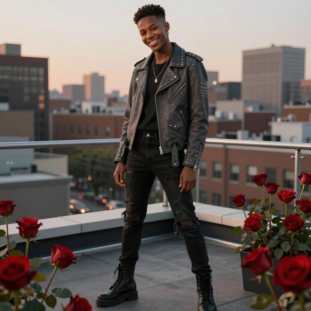 An artistic portrayal of a young Black non-binary person with closely cropped natural hair, warm brown skin, a confident playful smile, and a subtle eyebrow piercing dressed in a tailored charcoal-gray leather jacket with silver studs, black ripped skinny jeans, and chunky combat boots, standing on a bustling urban rooftop terrace at twilight surrounded by vibrant red roses, rendered in a high-fashion cinematic editorial photograph — hyperreal, dramatic Rembrandt rim lighting, shallow depth of field, soft film grain, and rich saturated colors.