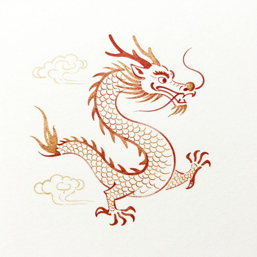 Simple Chinese dragon drawing, elegant minimalist style with flowing lines and traditional features, soft watercolor texture, muted red and gold tones, delicate scales and whiskers, floating amidst gentle clouds on a clean white background.