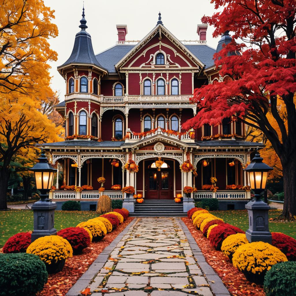 A charming Victorian-style house decorated for autumn with pumpkins, colorful chrysanthemums, and hanging orange wreaths. The pathway is lined with fallen maple leaves and flanked by stone pillars topped with pumpkins. Surrounded by vibrant fall foliage in shades of deep amber, red, and yellow.