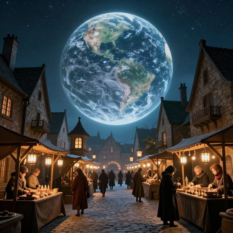 A medieval marketplace thrives beneath an enormous, otherworldly sphere suspended in the sky, casting an ethereal glow over cobblestone streets lined with lantern-lit stalls and cloaked figures.