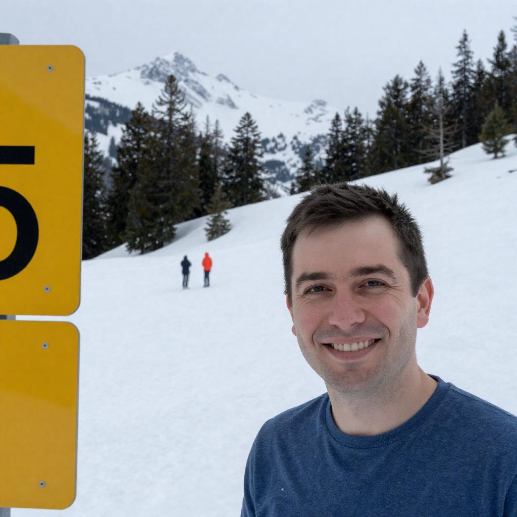 Photograph of a smiling man with short dark hair, wearing a blue shirt, in a snowy mountain landscape. Yellow sign on the left with . Background shows snow-covered peaks, trees, and two small figures in the distance.