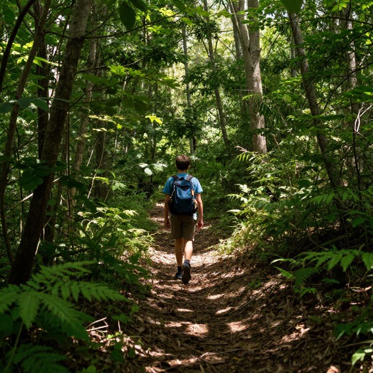 Youth exploring a dense forest trail, dappled sunlight filtering through leaves, adventurous and curious mood, detailed flora and fauna, natural earth tones, wide-angle perspective, evoking a sense of wonder and discovery.