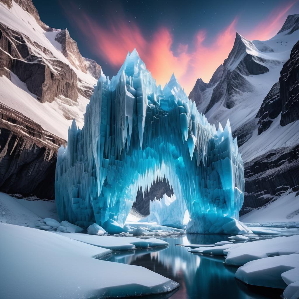 A stunning icy mountain landscape featuring sharp blue ice formations and a calm reflective body of water. Jagged snow-covered peaks rise dramatically against a vibrant sky at sunset, casting colorful reflections on the water's surface.