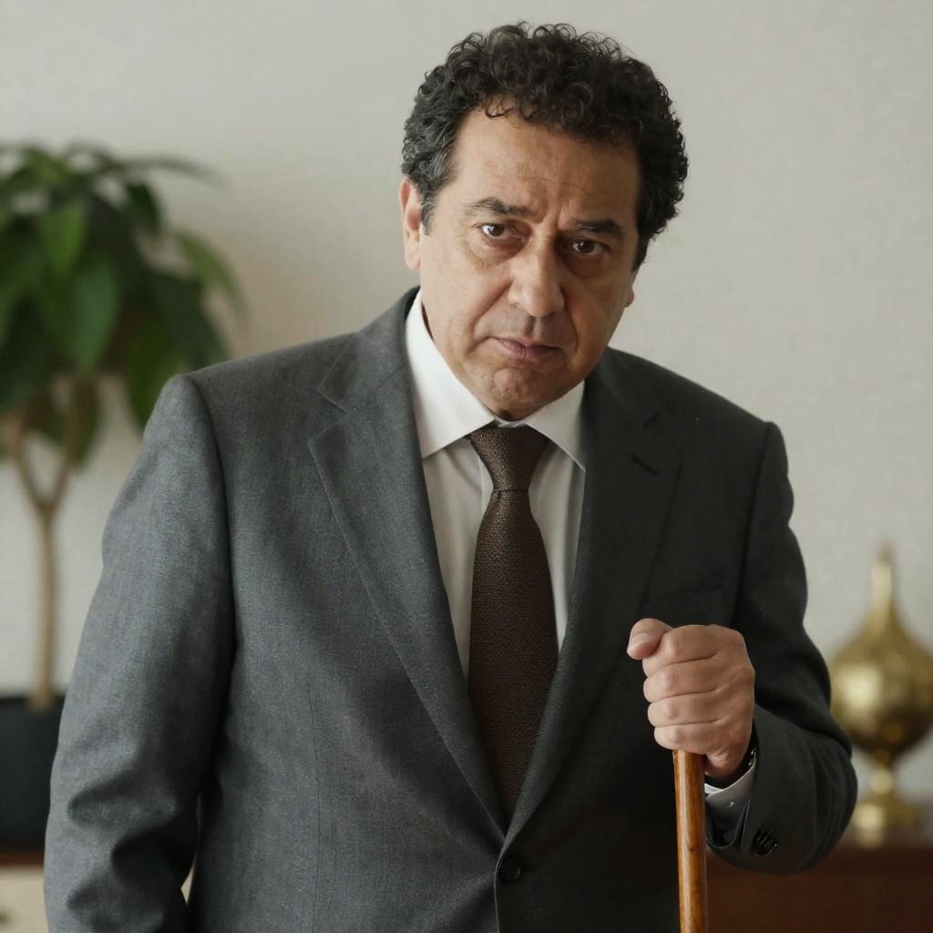 Photograph of a middle-aged man with dark curly hair, wearing a gray suit and brown tie, holding a wooden cane. He has a serious expression and is indoors. Background includes a blurred green plant and decorative items. Man is centered, facing slightly to the right.